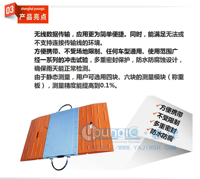 便攜式汽車衡稱重板精選超高強(qiáng)度鋁合金,外表面采用高品質(zhì)軍工鋁氧化處理耐磨耐腐蝕,經(jīng)一系列的沖擊試驗(yàn),多重密封保護(hù),防水防腐蝕設(shè)計(jì),確保雨天能正常檢測(cè)。重量輕,便于攜帶,精度高,重復(fù)性好,橫向一致性誤差小。帶有高強(qiáng)度電纜保護(hù)彈簧,不怕汽車車輪碾壓,腰型孔把手設(shè)計(jì)永不損壞。電纜信號(hào)插頭為進(jìn)口件。高品質(zhì)橡膠引坡表面雙重防滑花紋設(shè)計(jì),做工精致美觀,堅(jiān)固耐用,和稱重板燕尾槽連接,避免臺(tái)板和引坡脫開,整體式結(jié)構(gòu)動(dòng)態(tài)信號(hào)響應(yīng)速度快,頻率高。